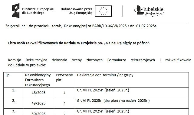 01.07.2025r. - Odbyło się VI posiedzenie Komisji Rekrutacyjnej. Do Projektu „Na naukę nigdy za późno” zakwalifikowało się kolejne osoby w tym dodatkowe osoby dorosłe zainteresowane udziałem w projekcie tworzące listę rezerwową do projektu.